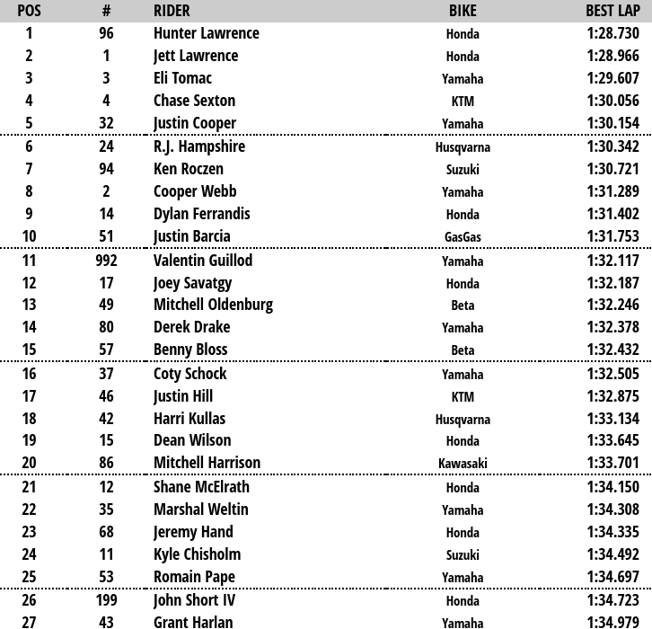 Justin Cooper led a Yamaha 1-2-3 in Free Practice 1, followed by teammates Eli Tomac and Cooper Webb. In FP2, however, Hunter and Jett Lawrence put Honda on top with a 1-2 finish, also taking the top two spots in the combined times.