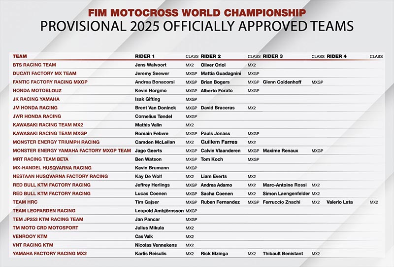Infront Moto Racing se complace en presentar la lista provisional de equipos oficialmente aprobados (OAT) para el Campeonato Mundial de Motocross FIM 2025. La lista cuenta con 23 equipos entre los que destacan, como grandes novedades, la incorporación de Ducati con Jeremy Seewer y Mattia Guadagnini o el regreso de Kawasaki como estructura oficial a MX2, en este caso con el vigente Campeón EMX250 Mathis Valin.