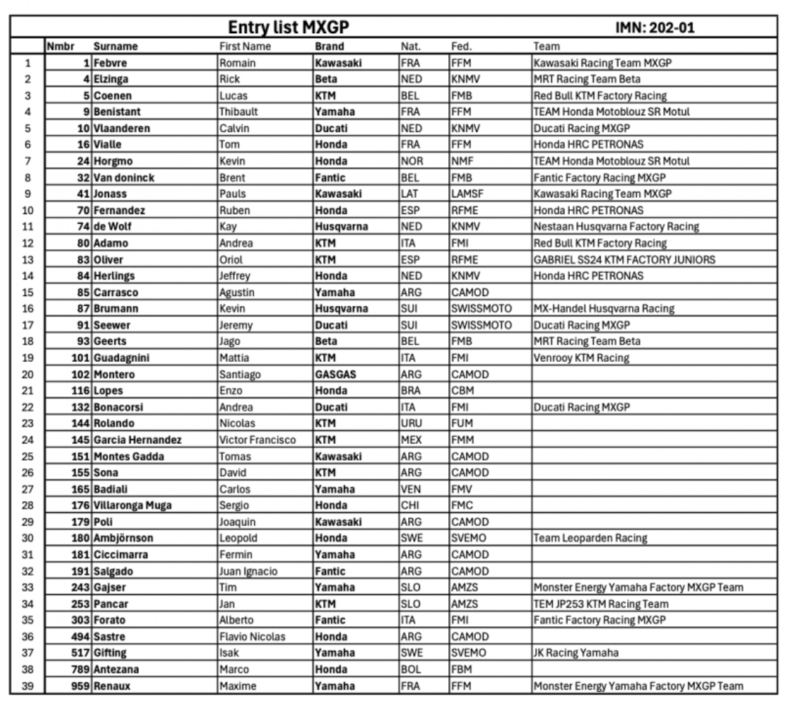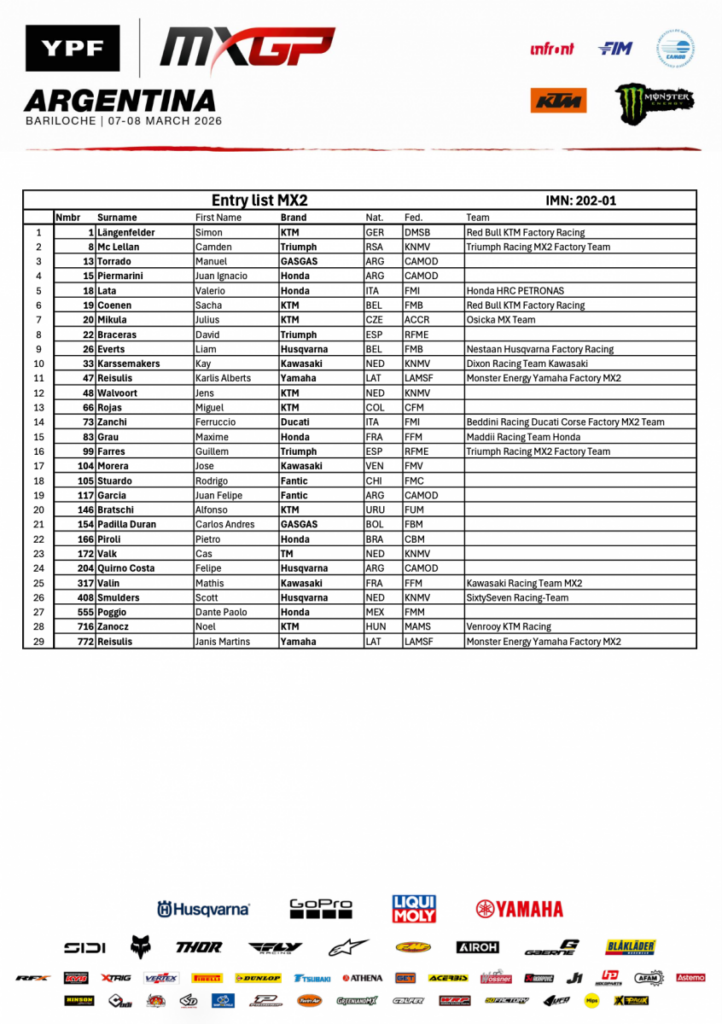 Las listas de inscritos provisionales oficiales para las categorías MXGP y MX2 presentan una nutrida lista de ex campeones mundiales, aspirantes al título y estrellas emergentes, listos para luchar por el impulso inicial del campeonato en Argentina.