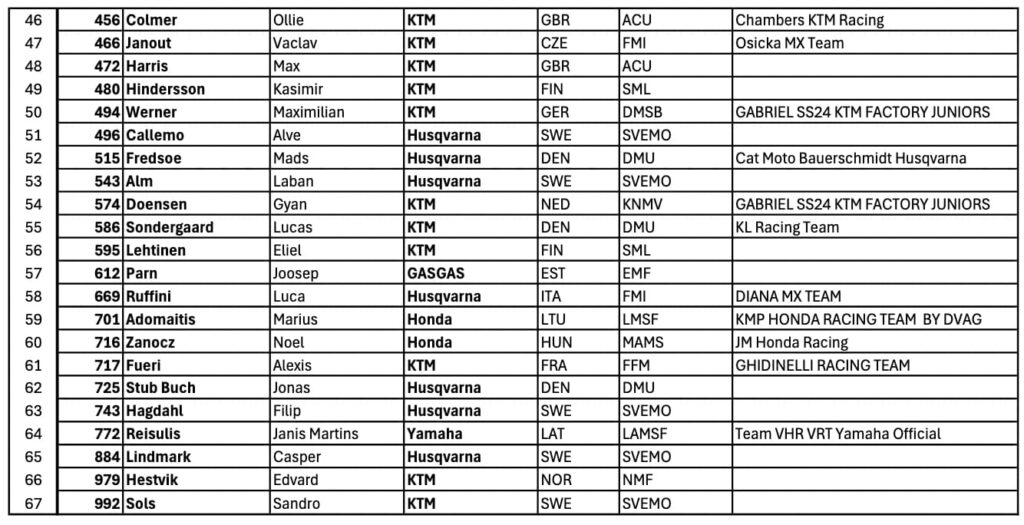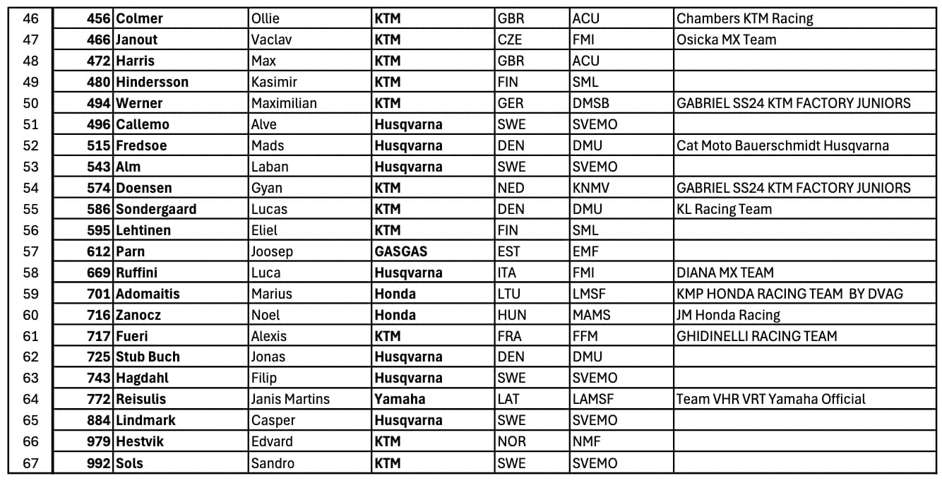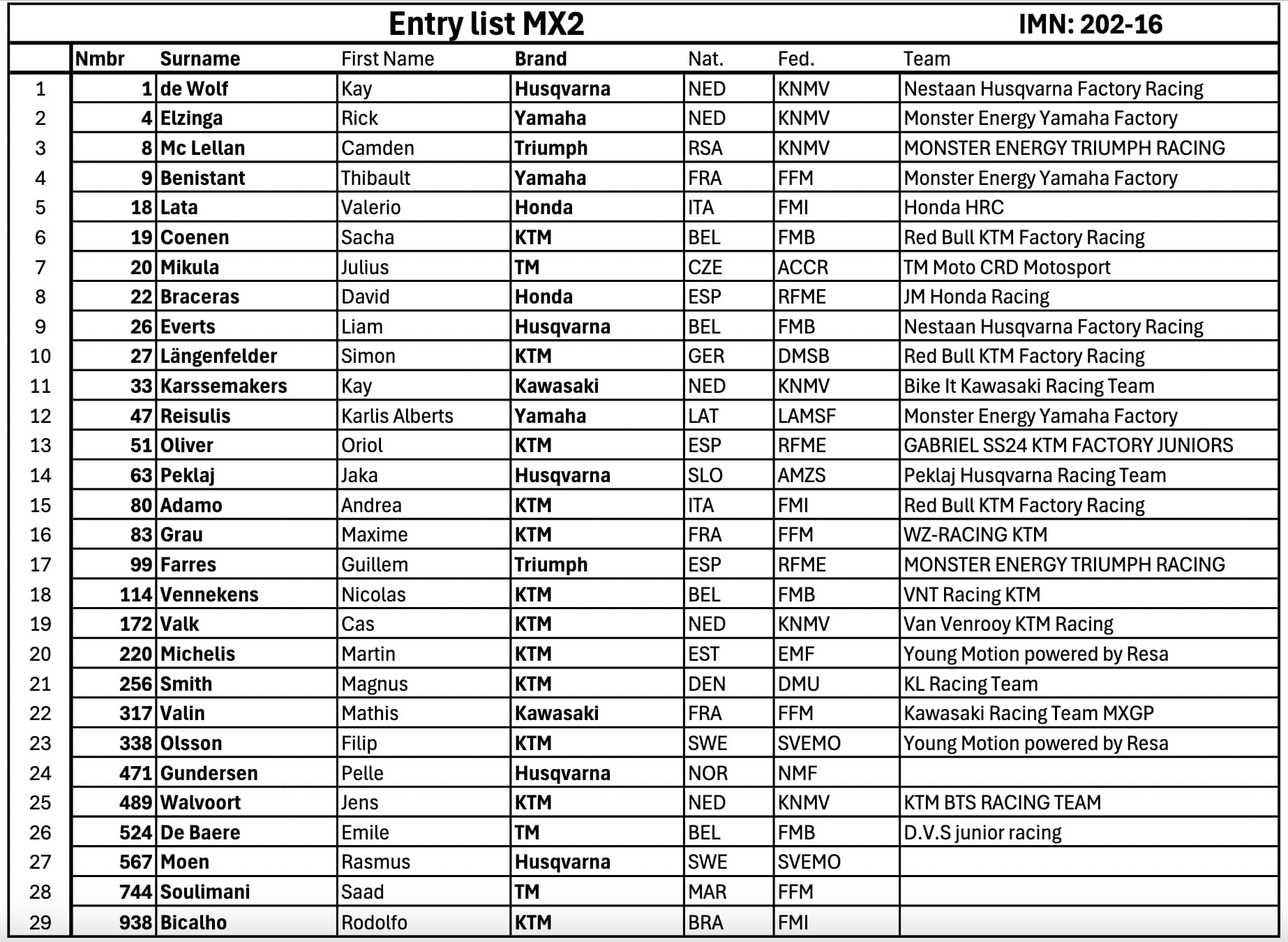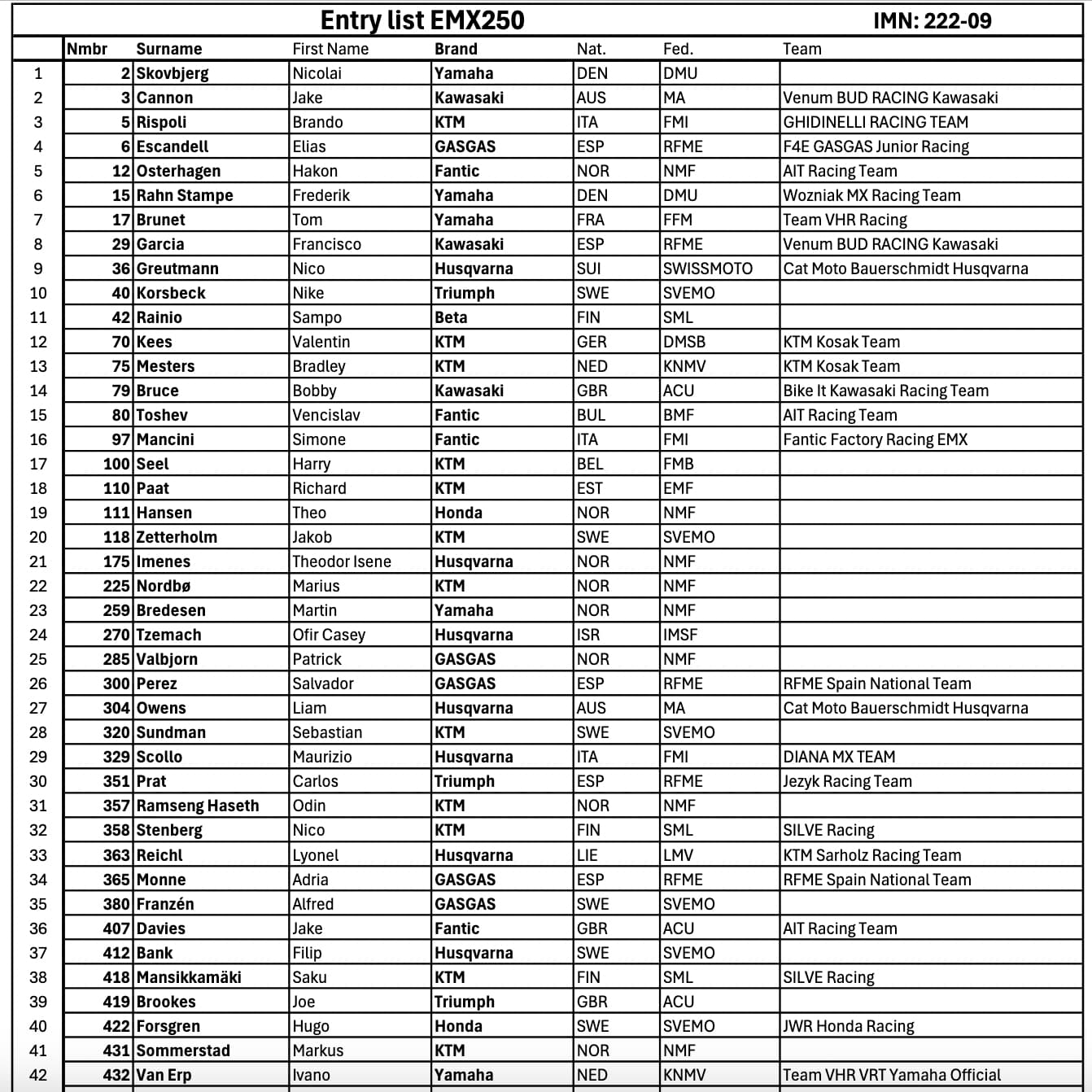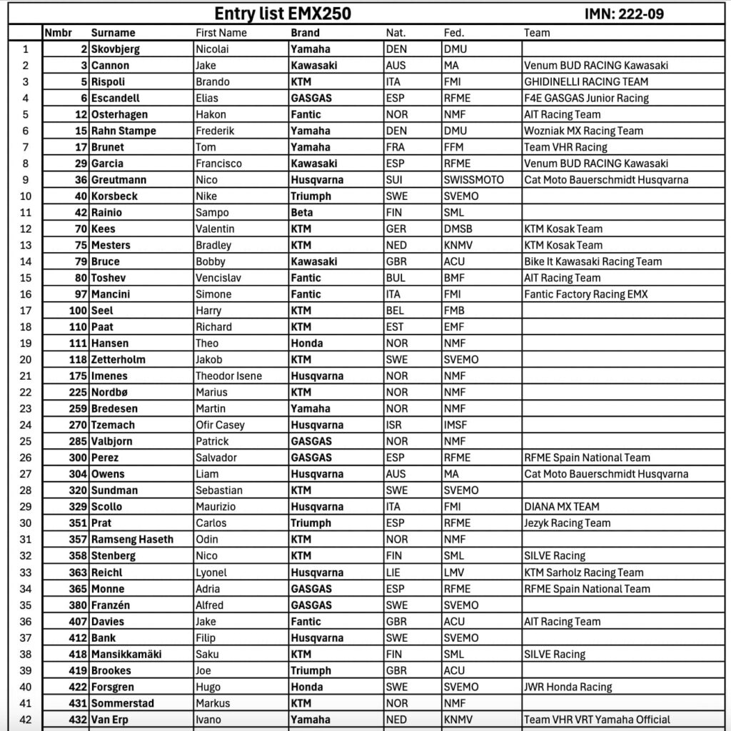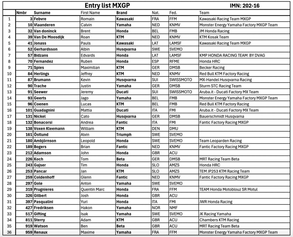En la categoría reina de MXGP volverá a ser Rubén Fernández la gran baza española, mientras que en MX2 estarán Oriol Oliver, después de ser tercero este fin de semana en el Campeonato Británico, y Guillem Farrés. No estará David Braceras, baja por lesión.