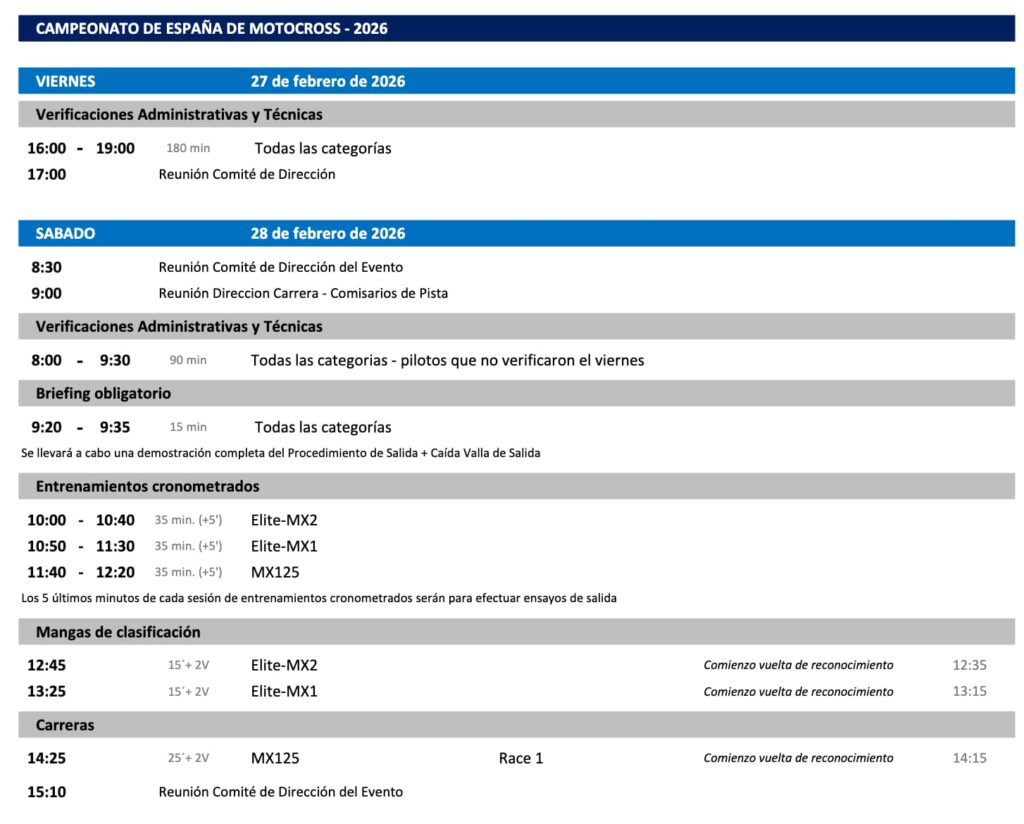 El Campeonato de España de Motocross Elite 2026 arranca este fin de semana en Calatayud, Zaragoza. Se citan las categorías de MX1, MX2 y MX125, que en total sumarán alrededor de pilotos.