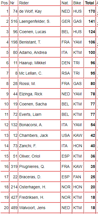 Top 20 MX2 Points Standings post Round 3 (of 20)