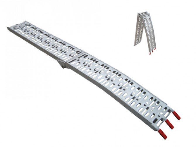 Existe en el mercado una fantástica rampa de aluminio que tiene la ventaja de plegarse por la mitad, por lo que ocupa muy poco espacio. Al ser de aluminio es muy ligera y consistente, puede soportar hasta 375 kilogramos de peso.