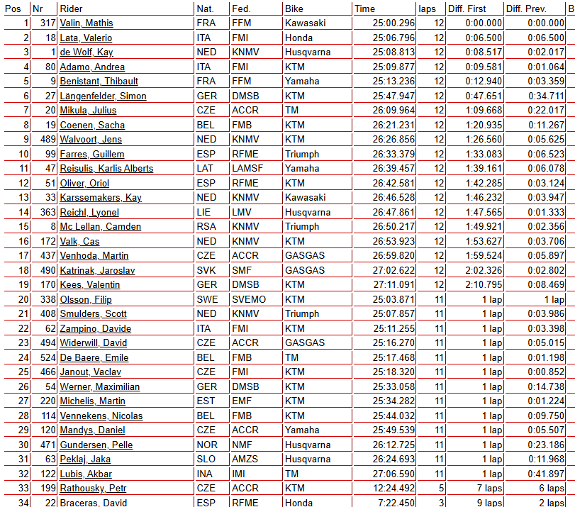 El líder del campeonato, Simon Langenfelder (Red Bull KTM), finalizó sexto tras remontar desde atrás. El ídolo local Julius Mikula (TM Racing) fue séptimo, seguido por Sacha Coenen, Jens Walvoort y Guillem Farrés (Monster Energy Triumph), quien se recuperó de una caída temprana para sumar el último punto en juego. Oriol Oliver (Gabriel SS24 KTM) terminó 12º y David Braceras (JM Honda) debió abandonar tras una caída en la primera curva.