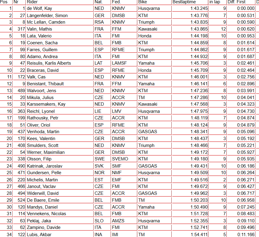 El actual campeón del mundo, Kay de Wolf, dominó la sesión de cronos en MX2 con autoridad. El piloto de Nestaan Husqvarna fue mejorando sus tiempos vuelta tras vuelta hasta marcar un 1:43.245, superando por más de medio segundo al líder del campeonato, Simon Längenfelder (Red Bull KTM), y a Camden McLellan (Monster Energy Triumph).