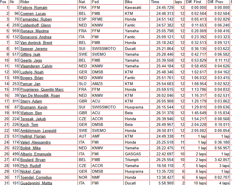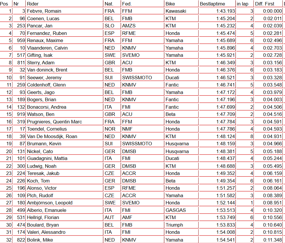 La sesión cronometrada de MXGP estuvo marcada por ráfagas de lluvia al inicio, que dejaron el trazado resbaladizo y técnico. Los mejores tiempos llegaron en las primeras vueltas, justo antes de que el agua afectara seriamente el agarre. Romain Febvre (Kawasaki KRT) fue el más rápido con un registro de 1:43.245, superando por más de dos segundos a Lucas Coenen (Red Bull KTM). Ambos pilotos lograron sus vueltas rápidas en los giros 3 y 2 respectivamente, antes de que las condiciones empeoraran y la mayoría optara por no arriesgar.