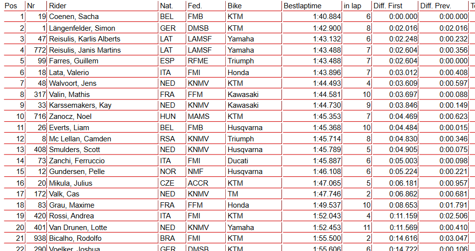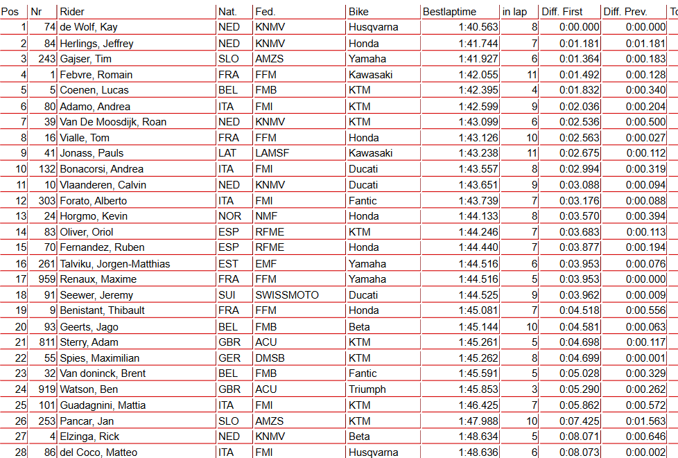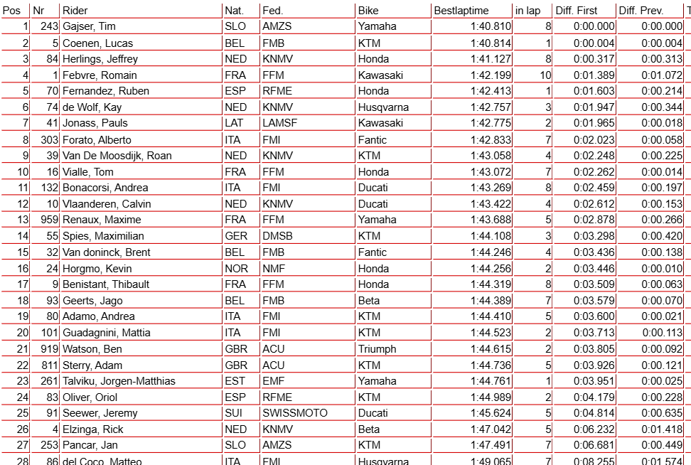 Desde la primera vuelta, Coenen marcó el ritmo de la sesión, liderando con autoridad gran parte del crono. Sin embargo, a falta de pocos minutos para el final, Gajser lanzó una vuelta decisiva que le permitió quedarse con el mejor tiempo, relegando además a Jeffrey Herlings (Honda HRC Petronas) a la tercera posición.