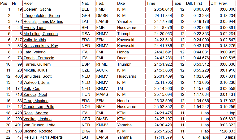 Por detrás, la lucha por las demás posiciones estuvo marcada por múltiples adelantamientos. El vigente campeón, Simon Längenfelder (Red Bull KTM), tuvo que abrirse paso en varios duelos antes de consolidarse en la segunda posición, seguido por el debutante Jānis Reišulis (Monster Energy Yamaha), que volvió a mostrarse competitivo en el grupo delantero.