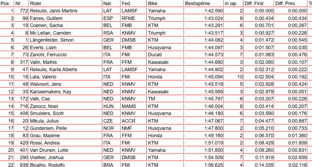 El novato Janis Reisulis (Monster Energy Yamaha) logra su primera pole en el Mundial de MX2 tras cuajar un tiempo de 1:42.590 en la segunda vuelta. A partir de ahí, todos estuvieron a la caza del joven letón durante el resto de la sesión. Cerca del final, Guillem Farrés (Triumph Factory Racing) cerró una gran vuelta, que le acercó a menos de medio segundo.