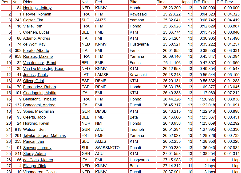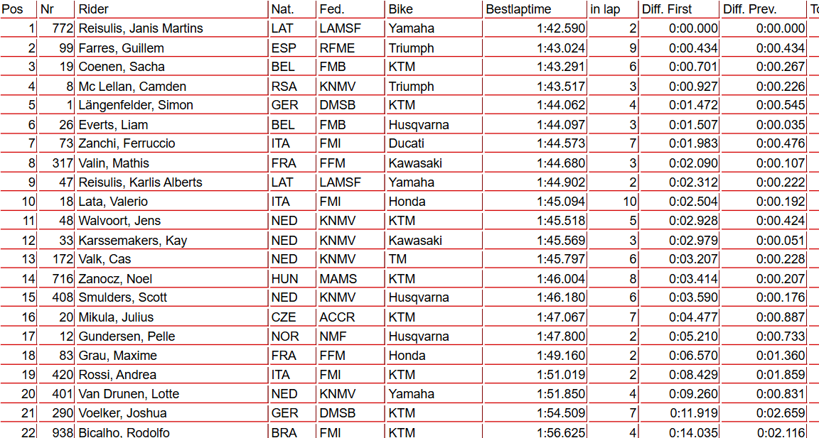 El top 5 lo completaron Liam Everts (Nestaan Husqvarna) y Camden McLellan (Triumph Factory Racing), ambos beneficiados por las caídas en los compases finales de Kārlis Reišulis (Monster Energy Yamaha) y Guillem Farrés (Triumph Factory Racing).