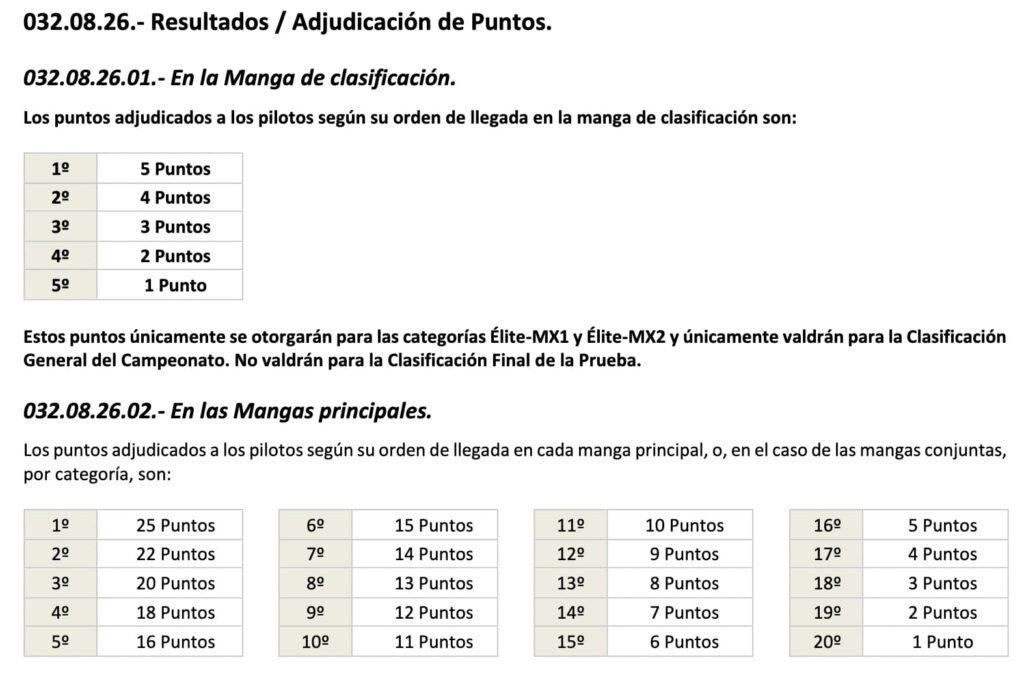 De este modo, desde la Real Federación Motociclista Española (RFME) se ha determinado que los cinco primeros, diez en el Mundial, se llevarán 5, 4, 3, 2 y 1 puntos respectivamente, algo que a final de temporada puede ser determinante para conocer a los ganadores de los títulos en juego.