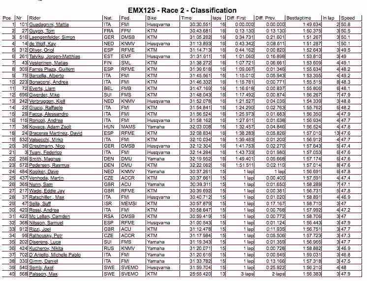 Oriol Oliver y Guillem Farrés han vuelto a jugar un papel destacado hoy en la segunda manga del EMX125. Oliver, que ayer tuvo muy mala suerte ha podido resarcirse con un 5º puesto, muy cerca del cuarto y demostrando que está entre los mejores de la categoría. Acaba 6º el fin de semana. Por su parte, Guillem Farrés, que partía con un tercero de la primera manga ha acabado 8º para finalmente ser 4º en el global, quedándose a únicamente tres puntos del podio.