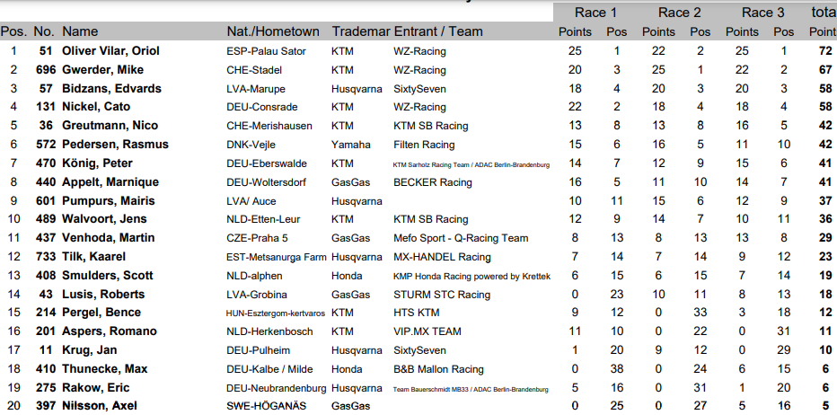 En la primera manga, disputada el día sábado, Oliver dominó de cabo a rabo tras tomar la delantera en los primeros compases de carrera. Sus compañeros de equipo del KTM WZ Racing, Mike Gwerder y Cato Nickel, se enzarzaron en una reñida lucha en los últimos giros que finalmente se decantaba por Nickel.