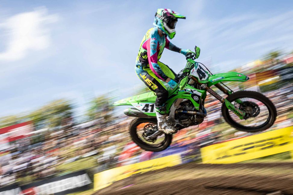 Kawasaki KRT rider Pauls Jonass endured a tough outing at the MXGP of Teutschenthal. The Latvian rider settled into a solid seventh place early in the first moto and held that position for most of the race—until disaster struck with just two laps to go. Jonass veered off track and suffered a heavy crash into an advertising arch, forcing him to withdraw from the event.