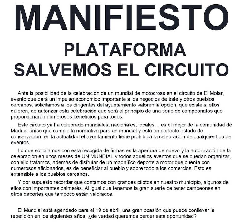 Plataforma para recuperar El Molar y ser sede del MXGP 2020