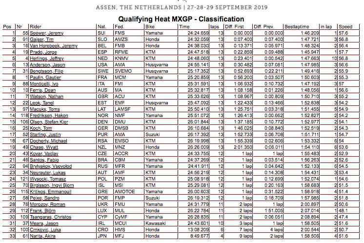 El doble campeón del Mundo de MX2 comandó los primeros giros pero una caída en la tercera vuelta le relegó fuera del Top 5 y se vio obligado a remontar de nuevo hasta la 4ª posición. Seewer ha sido quién se ha llevado el gato al agua, seguido de de Gajser y un Van Horebeek muy entonado durante todo el día sobre la arena holandesa. Cerrando el Top 5 ha entrado Herlings, que tras una mala salida entorno a la posición 20 se ha visto obligado a ir remontando posiciones.