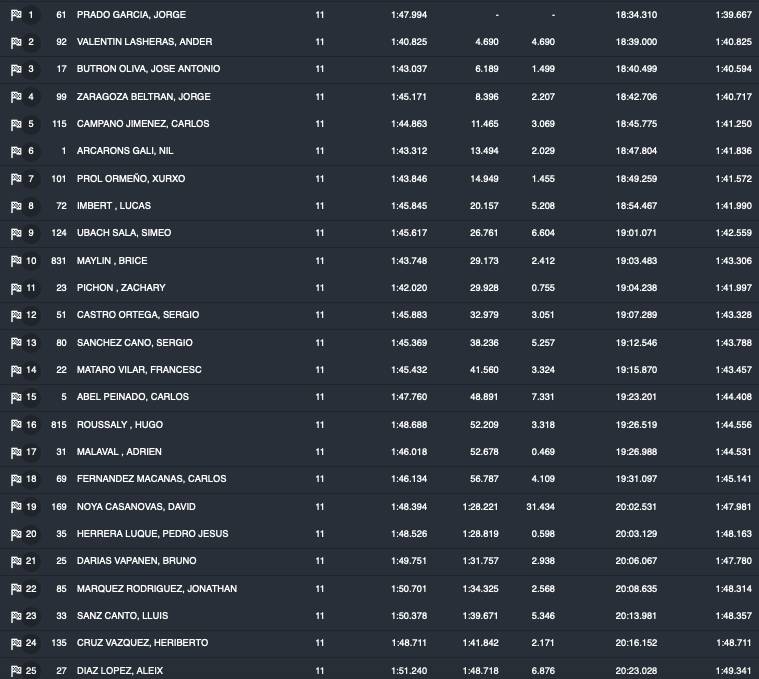 A falta de unos tres minutos, el valenciano de GRMXPro le ha robado la segunda plaza al de KTM TRT, pero todavía quedaba mucho por ver. Y es que Butrón se ha vuelto a poner segundo en la última vuelta y estaba muy pegado Zaragoza, pero por detrás galopaba un Ander Valentín que les arrebataba a ambos la segunda plaza.