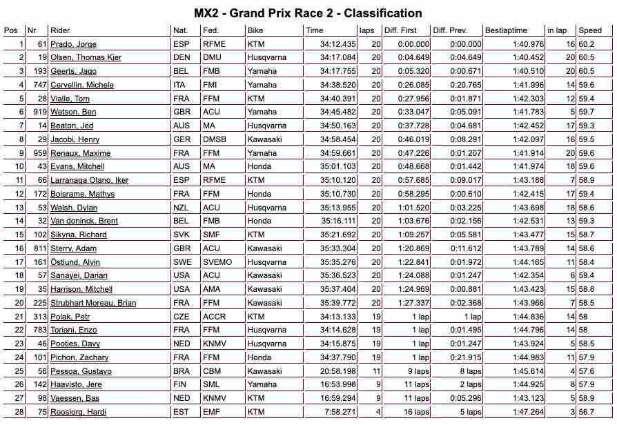 La segunda entrada y definitiva a pista ha sido más ‘normal’. Holeshot para Prado y camino hacia un nuevo capítulo de gloria en solitario, sin complicaciones. Por detrás arrancaba en tercera posición un excelente Iker Larrañaga que bien merece un artículo para él solito. Una vez se levantaba la banderola ‘damera’ que marcaba un nuevo hito de Jorge Prado, se veía pasar de nuevo a Olsen y Geerts, un joven belga que no le puso nada fácil las cosas a su predecesor, aunque en esta ocasión no pudo superar a la Husqvarna del danés.