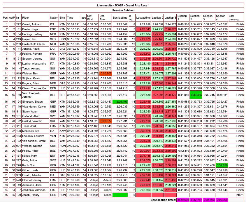 Jorge Prado ha sido segundo en una excelente manga de los dos pilotos de De Carli, mientras que les ha seguido Jeffrey Herlings y Tim Gajser, el actual líder.