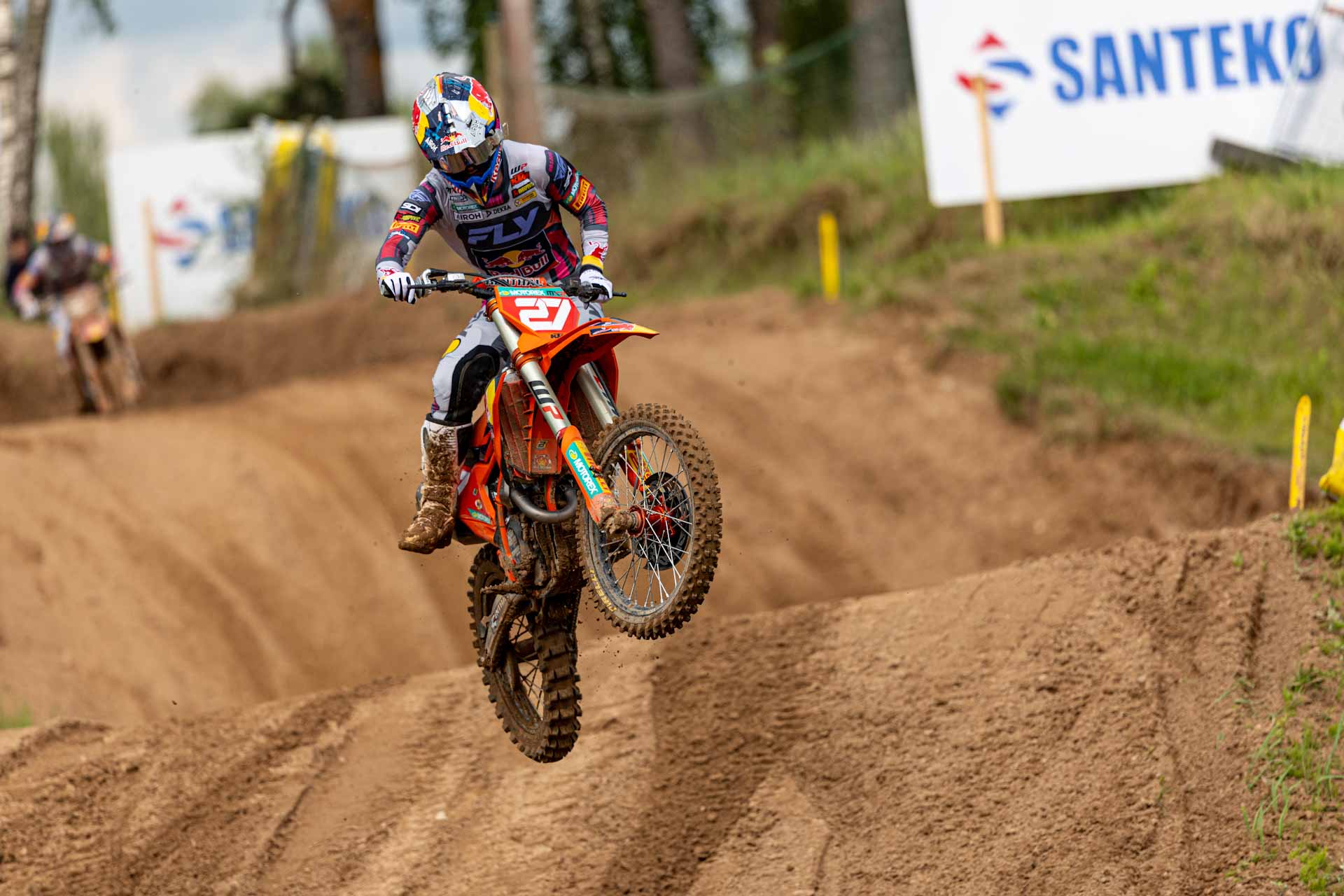 La pelea por el liderato en MXGP se tiñe de naranja. Jeffrey Herlings y Lucas Coenen, ambos del Red Bull KTM Factory Racing, han dominado los dos últimos Grandes Premios, con Herlings llevándose las victorias en Alemania y Letonia, y Coenen firmando dos segundos puestos consecutivos.