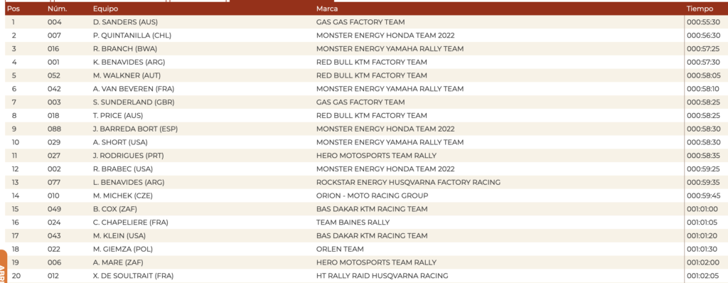 La Honda de Pablo Quintanilla ha rubricado el tramo en la segunda plaza y la Yamaha de Ross Branch ha sido tercera. Las KTM Factory se han tenido que conformar con la cuarta posición de Kevin Benavides y la quinta de Matthias Walkner.