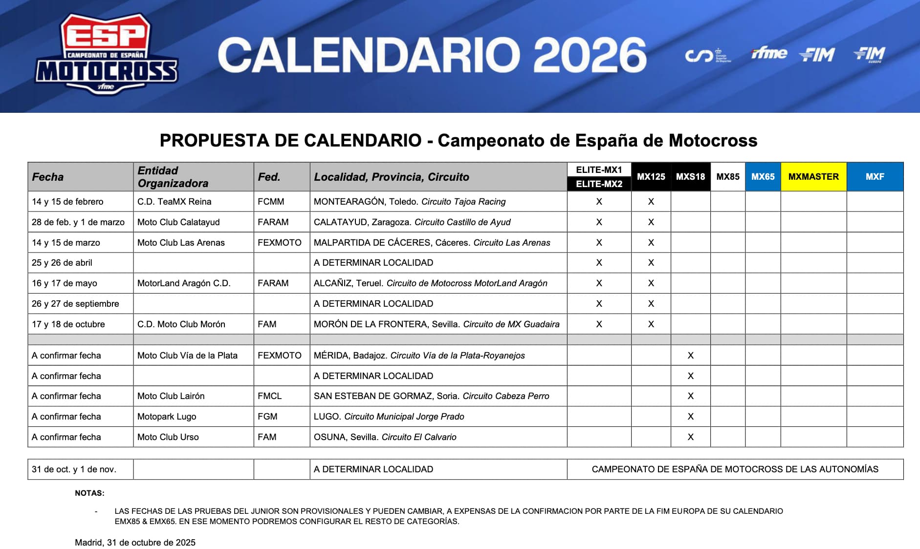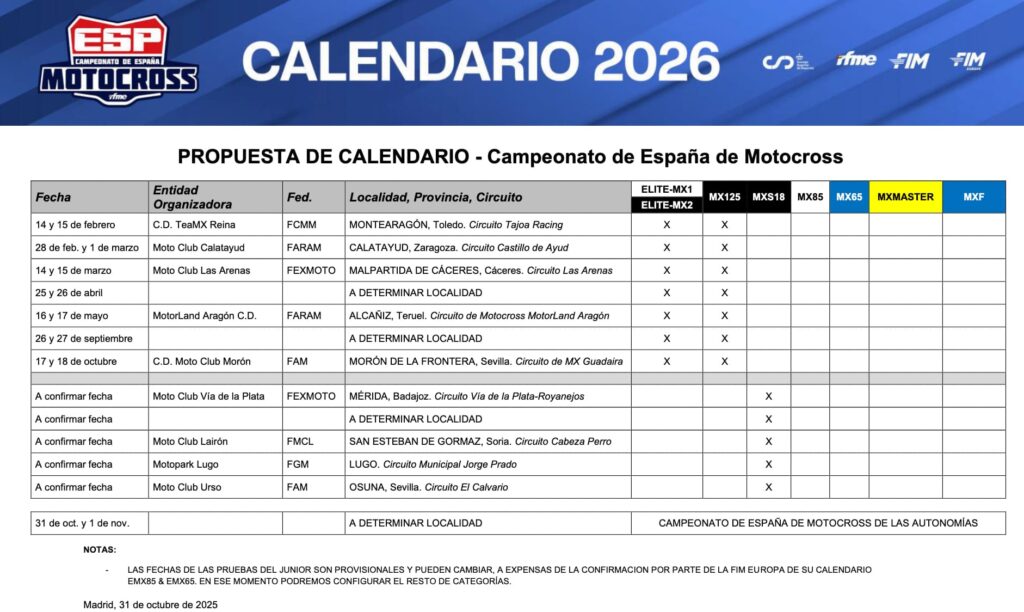 A falta de su aprovación en la Asamblea General de la RFME, la propuesta de calendario para los diferentes Campeonatos de España de Motocross 2026 es esta.