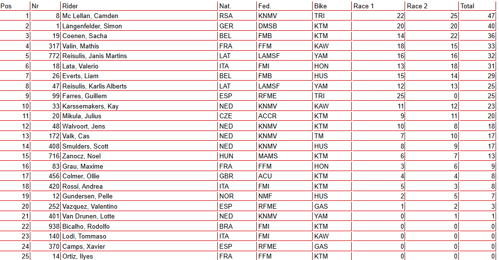 McLellan also takes over the championship lead, now sitting 2 points ahead of Längenfelder. Guillem Farrés, who won race one and briefly led the standings, suffered a mechanical DNF in race two and drops to third in the championship, now trailing by 19 points.