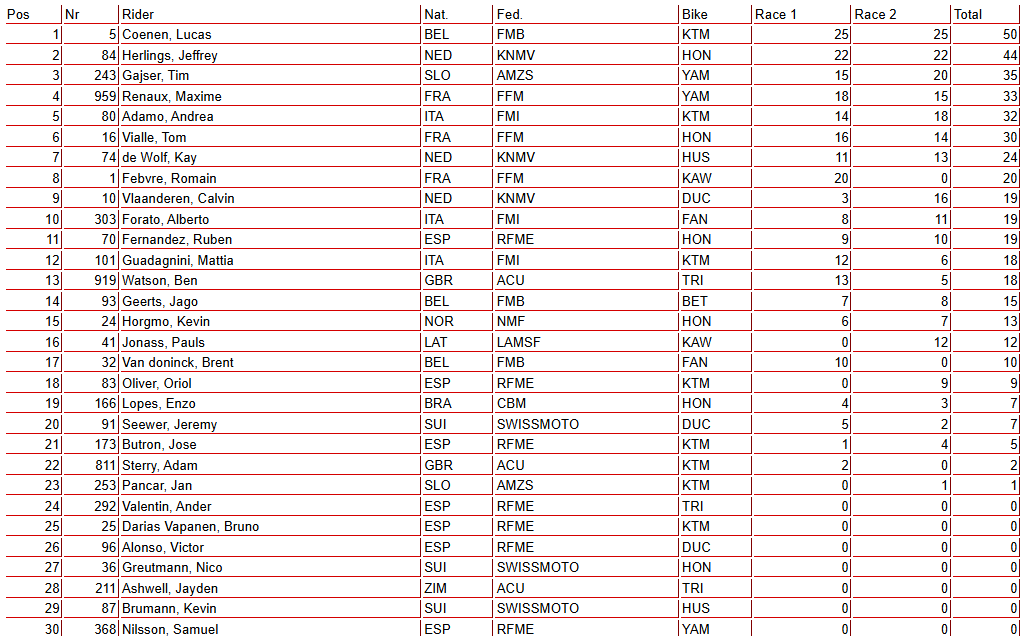In the championship standings, Coenen moves into the lead with 102 points, holding an 8-point advantage over Herlings (94). Tom Vialle drops to third with 89 points, while Febvre falls to fourth on 75.