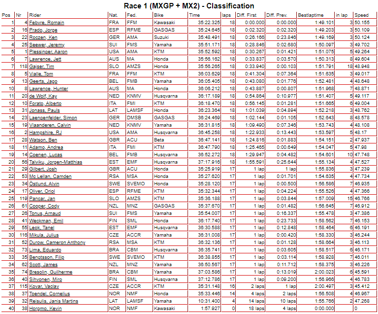 El 1-8 de Febvre y Vialle coloca a Francia como líder provisional con 9 puntos sobre 16 de Australia y 17 de Alemania. El top 5 de momento lo completan Estados Unidos (21pts) y España (26). La segunda carrera estará conformada por MX2 + OPEN.