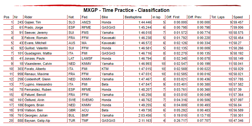 Due to the bad weather conditions at the MXGP of Turkiye, the Event Management decided to cancel the MXGP Qualifying Race. Today’s MXGP Time Practice session gives the results for tomorrow’s gate pick.