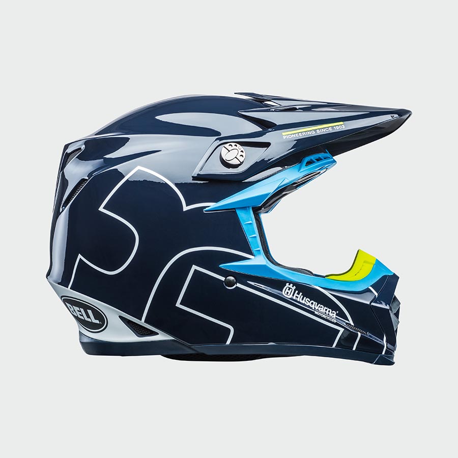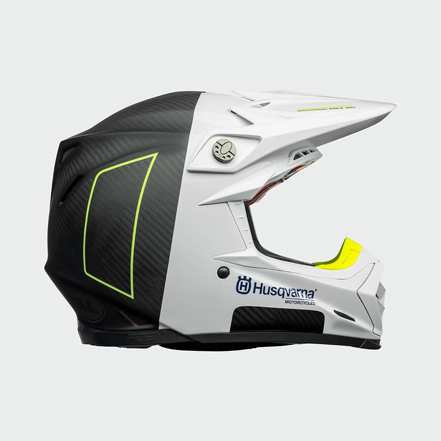Desarrollado por pilotos de talla mundial, el MOTO-9 FLEX RAILED HELMET está fabricado en exclusiva para Husqvarna Motorcycles por Bell Helmets. Con una ligera calota de fibra de carbono, está dotado de un exclusivo sistema de liberación de emergencia Magnefusion (M.E.R.S), junto con tornillos de tipo rápido en la visera para un ajuste rápido y seguro. La transpirabilidad óptima se logra a través de una zona de barbilla totalmente ventilada y una boquilla ventilada integrada. Con un cierre de doble D, su peso total es de 1.450 (±50 g). Hay otro modelo disponible, el MOTO-9 GOTLAND HELMET.