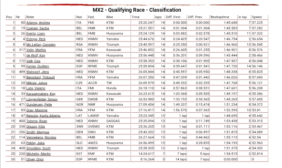 Con los favoritos en apuros, Andrea Adamo (Red Bull KTM) se mostró impecable. El siciliano ganó la partida a su compañero Sacha Coenen en las primeras curvas y, pese a los intentos de este por acercarse, controló la manga de principio a fin. Liam Everts (Neestan Husqvarna) completó el podio clasificatorio en tercer lugar.