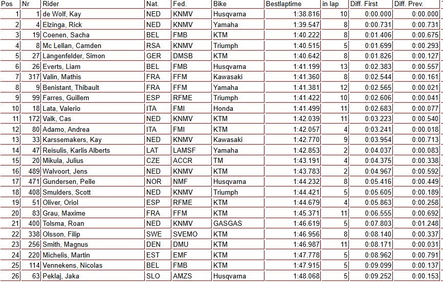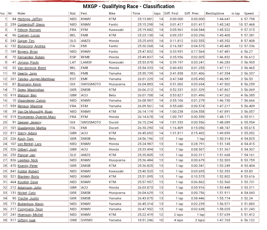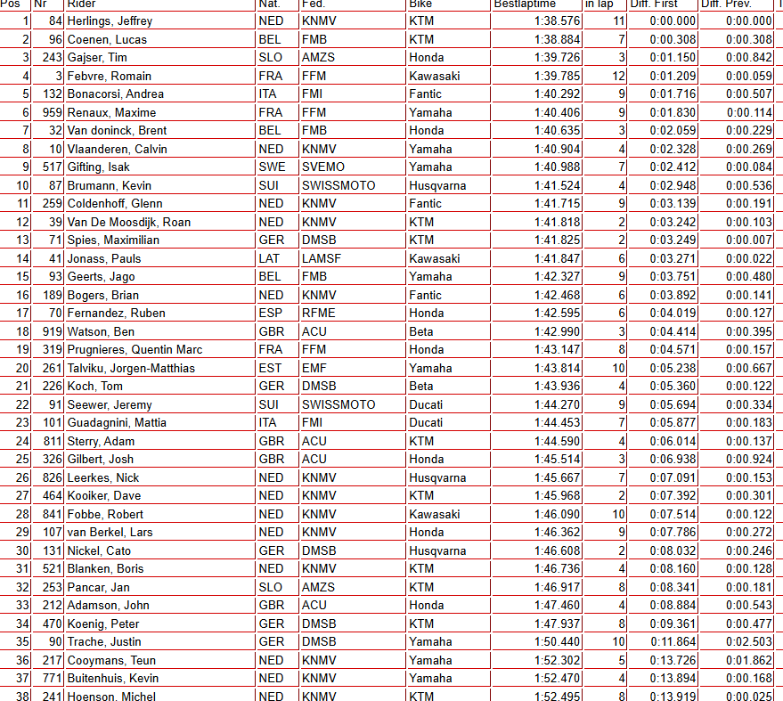 Herlings arrebató el mejor registro a Lucas Coenen en la vuelta final, batiéndolo por apenas tres décimas cuando el cronómetro ya había marcado el tiempo cumplido. Tim Gajser (Honda HRC) terminó tercero, a más de un segundo, mientras que Romain Febvre (Kawasaki KRT) esperó hasta los últimos minutos para marcar su vuelta y situarse cuarto.