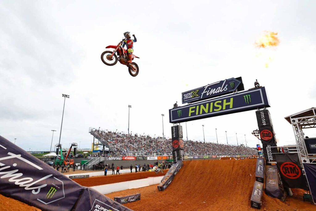 Como mucho sabeis, los pilotos que participan en el SuperMotocross son lo 20 mejores clasificados de cada categoría (más los clasificados de la respesca) en base a los puntos obtenidos tanto en supercross como en motocross. Los primeros clasificados de cada categoría – en este caso Chase Sexton en 450 y Hunter Lawrence en 250- fueron recompensados con 25 puntos; los subcampones con 22, los terceros clasificados con 20 y así sucesivamente hasta lo pilotos que cerraron el top 20. En Charlotte, a pesar de que se disputaron dos mangas, la puntuación final fue de 25 puntos para el ganador, 22 para el segundo y 20 para el tercero; y así bajando hasta el vigésimo lugar.