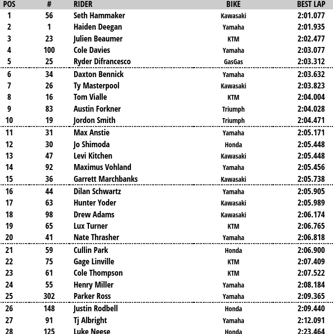 - Session 1: Haiden Deegan opened strong, topping the first outing ahead of Pro Circuit teammates Seth Hammaker and Garrett Marchbanks.