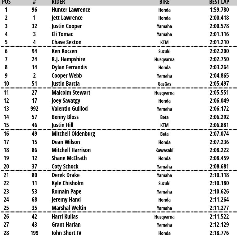 - Session 2: The Lawrence brothers then took control. Hunter Lawrence laid down the best lap of the day with a 1:59.780, edging Jett Lawrence by over half a second to lock in a 1–2.