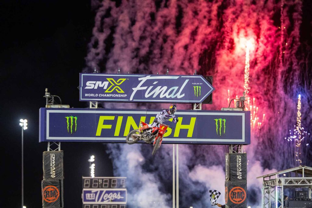 Jett Lawrence, del Team Honda HRC Progressive, se alzó con su tercer Campeonato Mundial de SMX consecutivo con una dramática victoria general en la pista de SMX construida sobre The Strip del Las Vegas Motor Speedway. Tras ganar la primera manga, Jett realizó una emocionante remontada al final de la segunda manga para alcanzar el segundo puesto. Sus resultados de 1-2 en las mangas se combinaron para ganar la carrera de la noche, la bonificación de $100,000 por ganar la carrera y, aún más importante, el premio de un millón de dólares por el campeonato.