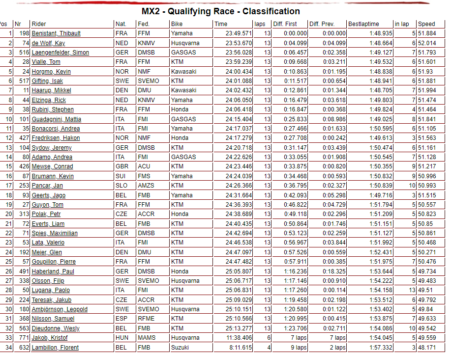 Las sorpresas no acaban aquí, ya que en MX2 la pole fue para Thibault Benistant. El francés eclipsa cinco meses de parón debido a una lesión de rodilla, y en apenas su segundo GP de la temporada, se hace con la pole position; la primera de su carrera. Destacar también el trabajo del esloveno Jan Pancar y el holandés Rick Elzinga, líder de las series EMX250, y debutante en MX2.