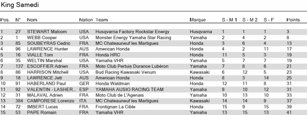 Malcolm Stewart y Luke Clout se llevaron la general en la primera noche de acción de la 42ª edición del Supercross de París. Stewart sorprendió a todos al arrasar en las tres carreras, mientras que Clout ganó dos de tres para perfilarse como el gran favorito a la corona de Príncipe de París.