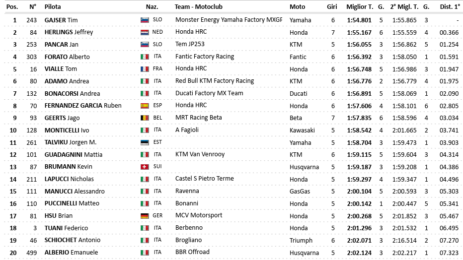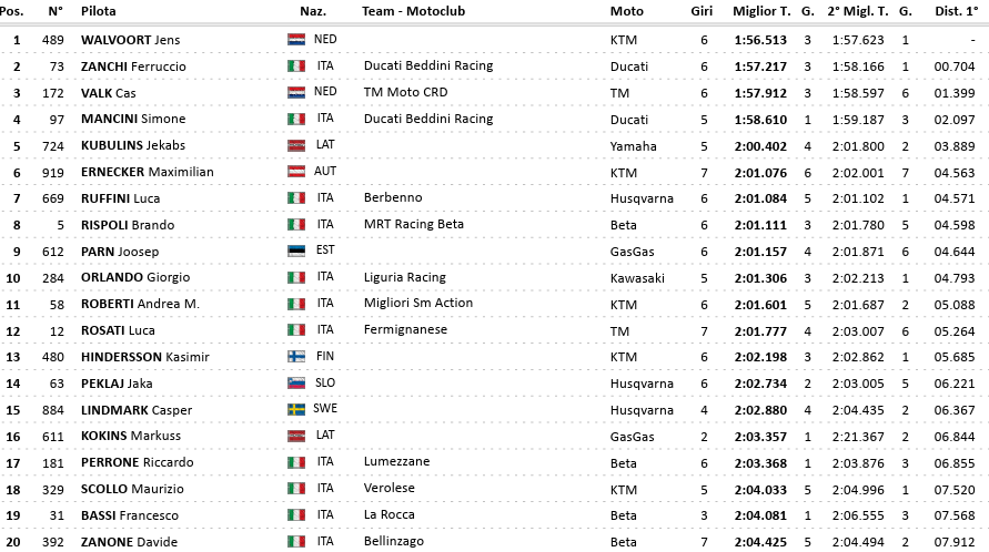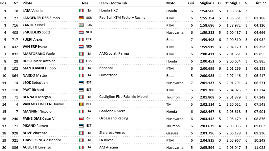 The MX2 category has been divided into two groups. In Group 1, Valerio Lata won with a lead of more than a second over the current world champion Simon Langenfelder. Meanwhile, in the second group, Jens Walvoort provided the surprise, followed by Ferruccio Zanchi.
