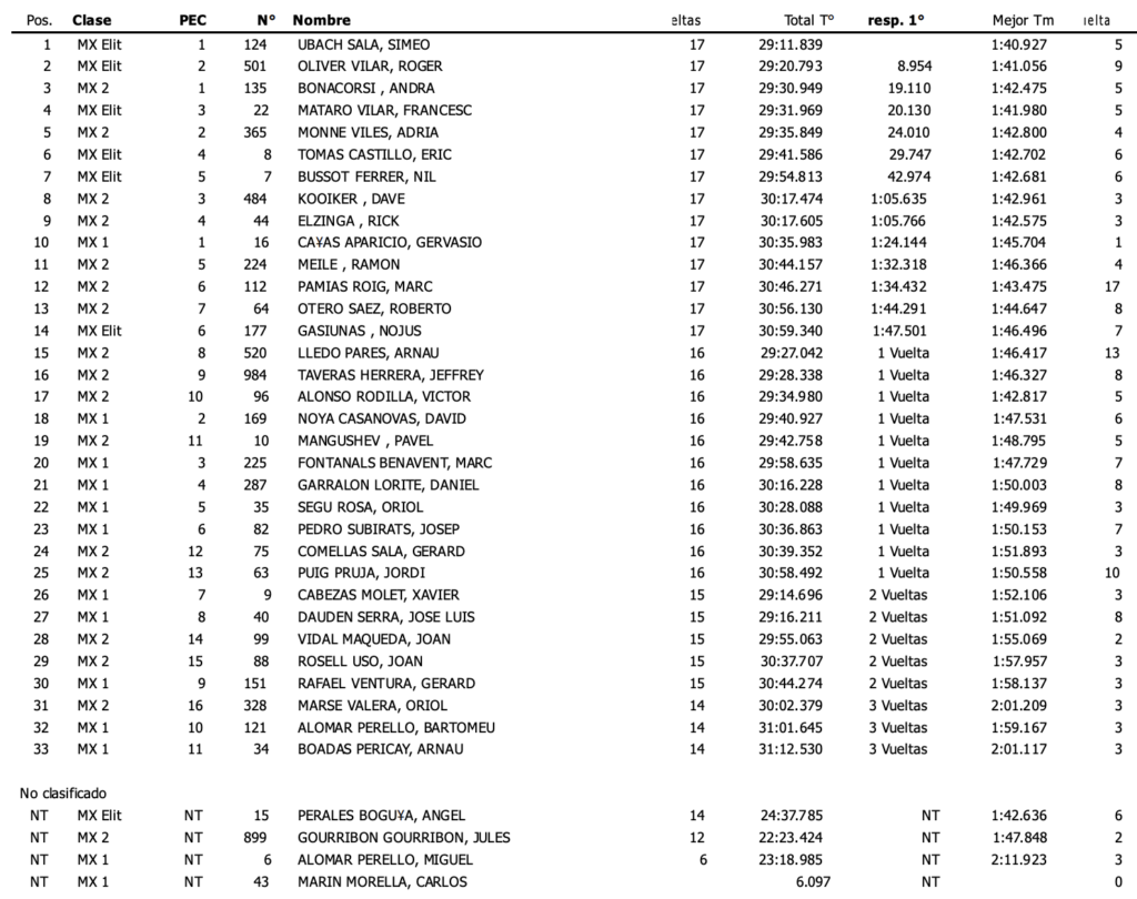 Simeó Ubach, que en 2022 afronta su segunda temporada sobre la 450 certificó las buenas sensaciones ofrecidas en Montearagón adjudicándose la primera manga de MX-Élite-MX1-MX2, seguido de Roger Oliver y del Campeón de Europa 125 2020 Andrea Bonacorsi. En la segunda sería Elzinga quién cruzaría la línea de meta en primera posición, seguido muy de cerca por Ubach y Francesc Mataró.