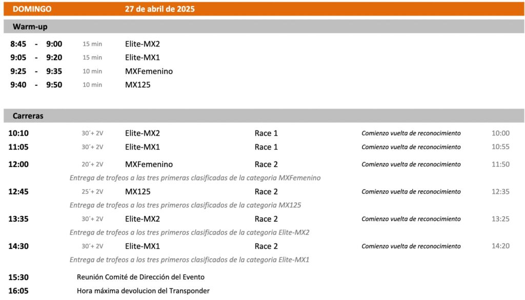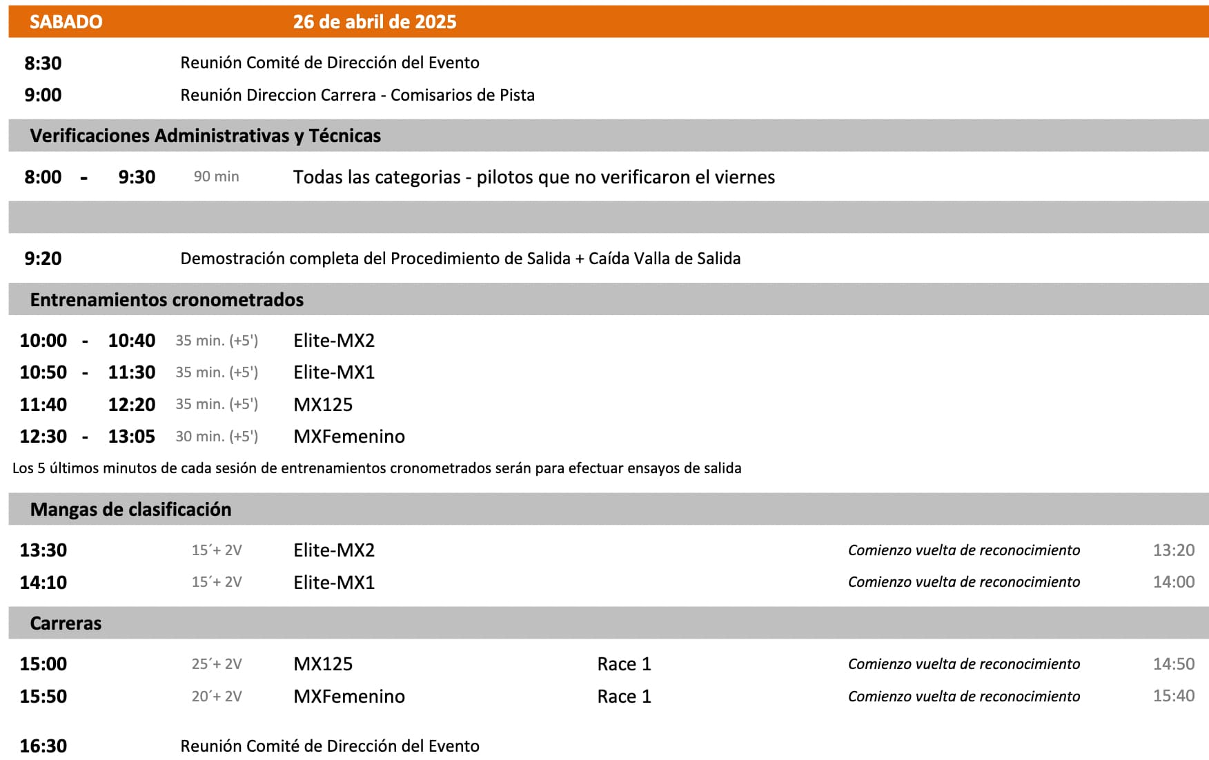 Estos son los horarios del sábado y del domingo. Recordamos que las carreras del domingo se podrán ver en directo en el Canal de Youtube de la RFME.