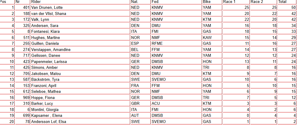 Lotte Van Drunen gana ambas mangas en Riola Sardo, primera cita del Campeonato del Mundo de Motocross WMX Féminas. Daniela Guillén comienza la temporada en séptimo lugar tras acabar 10-5 en las mangas.